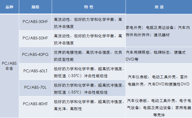 牌號(hào):PC/ABS-30HF、PC/ABS-50HF 、PC/ABS-40PG、 PC/ABS-60LT 、PC/ABS-70L、PC/ABS-80HT
